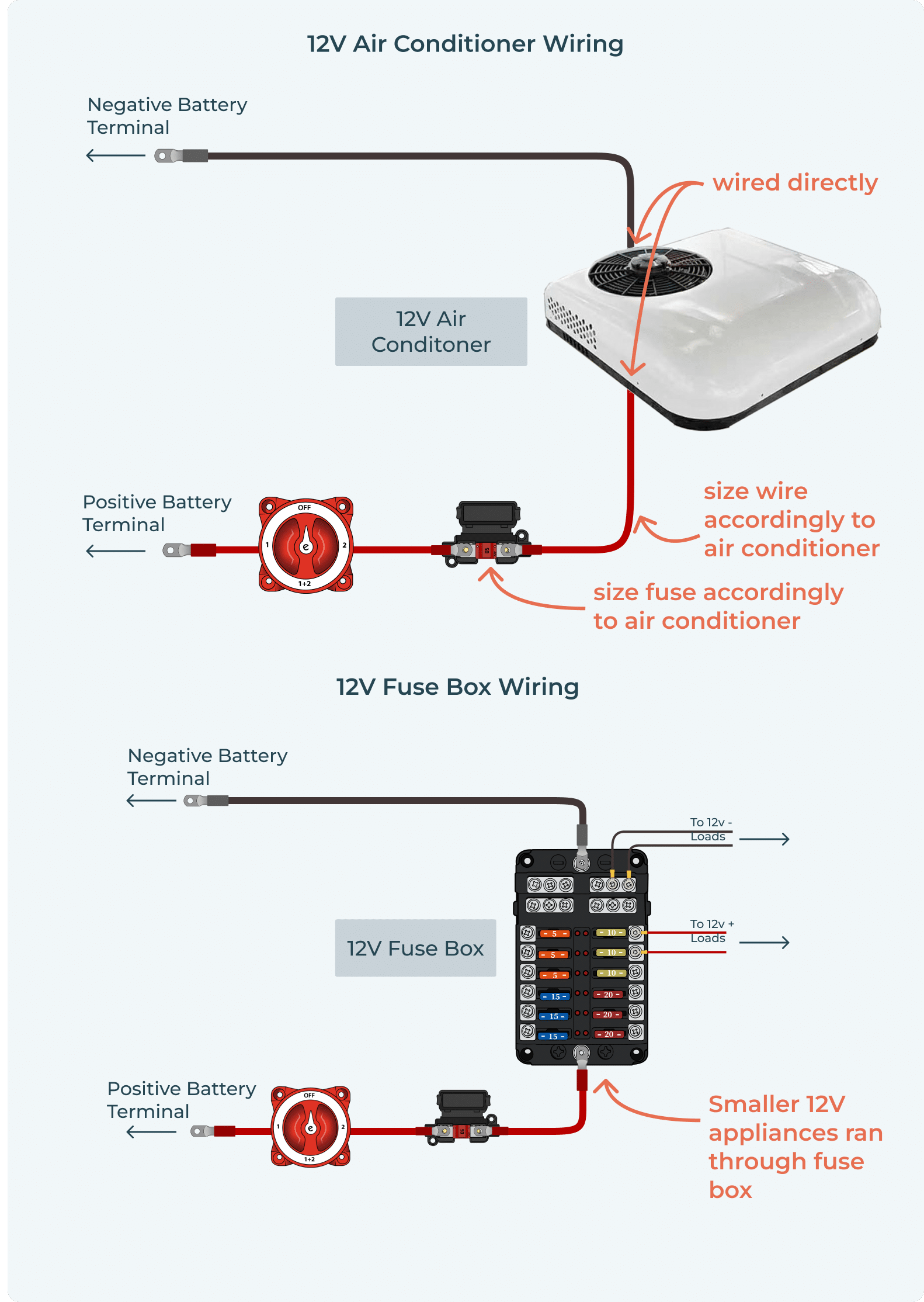 Most campervans will use a regular 12V fuse box for regular appliances like LED lights and a minifridge, but your air conditioner will usually require its own circuit due to the higher current that is drawn.