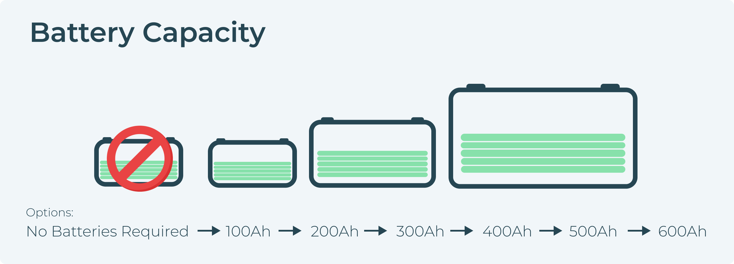 Your battery’s overall capacity is crucial when choosing a 12V air conditioner as it dictates how long the air conditioner can run when off-grid. For example, a 12V air conditioner drawing 100 amps can run for 4 hours on a 400Ah battery in eco mode. For higher power modes this runtime would be much shorter. This is why a high-capacity battery bank is essential for powering a 12V air conditioner off-grid for extended periods, such as overnight use.