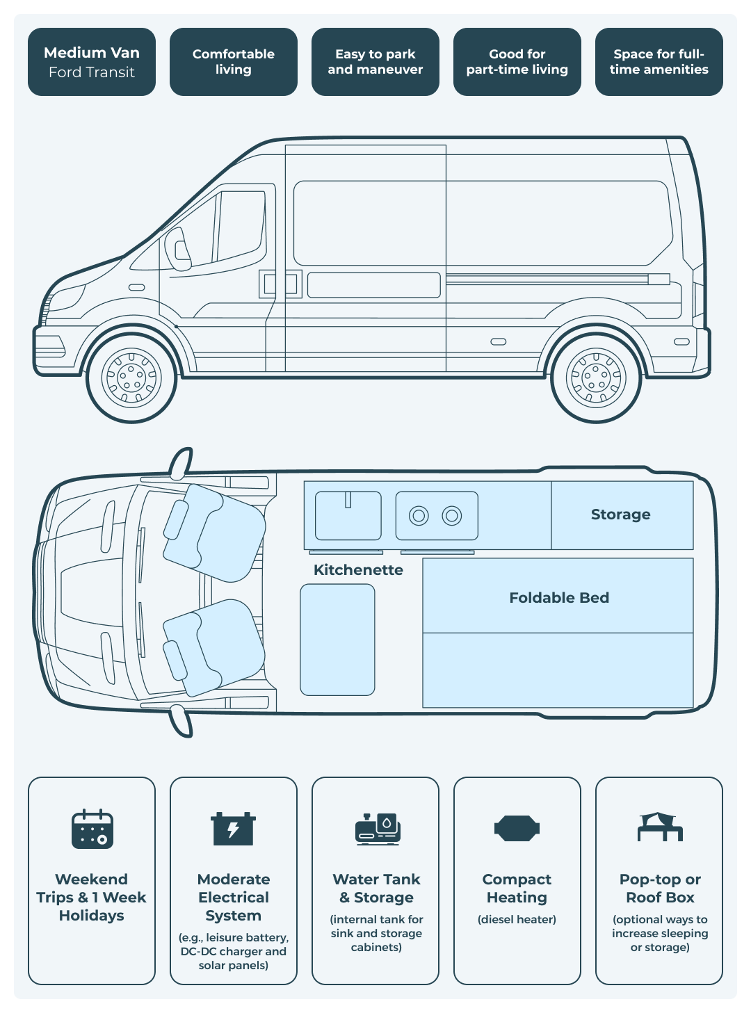 This will be the most important factor in your decision-making process. The best van for full-time living will differ greatly from the best van for occasional weekend trips, so be honest with yourself early on. Before deciding on a particular model, it can be helpful to first understand the sort of general size of van you should be looking at.