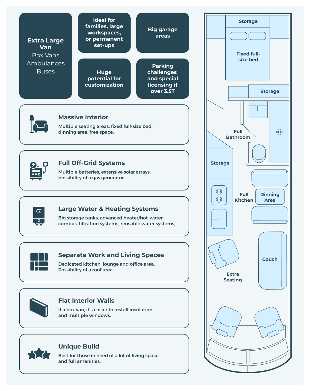Extra large or specialist options like box vans, ambulances or converted buses are also an option for those who need the absolute maximum amount of space.