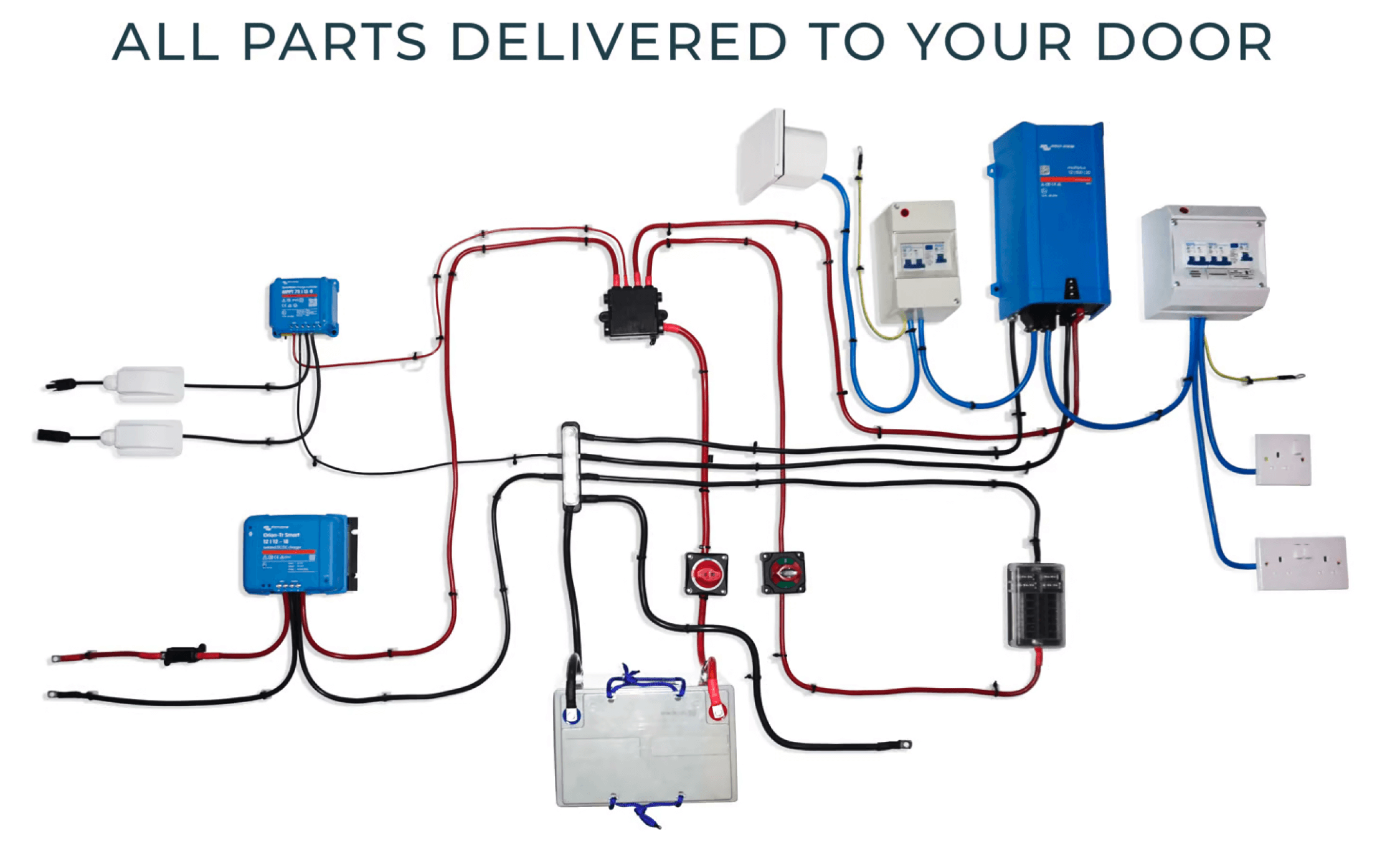 You can get this full campervan electrical system delivered directly to your door. Everything you need to install in your campervan will be included, down to the last wires, fuses and lugs.