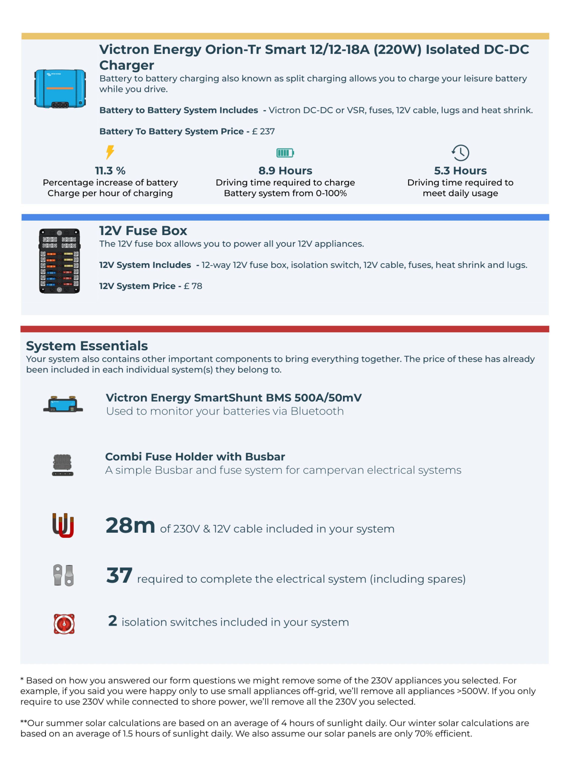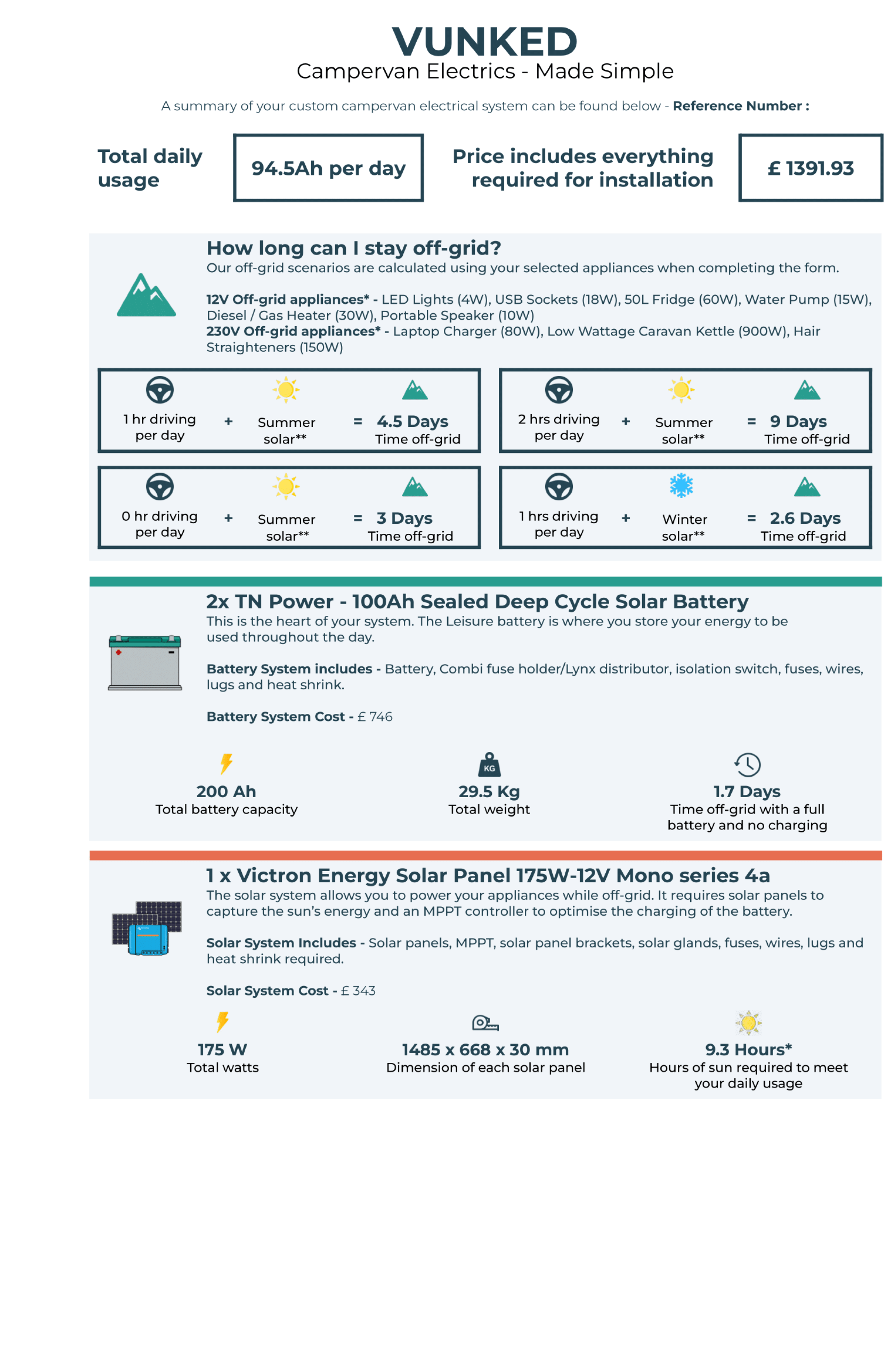 By giving us your contact details we can send this wiring diagram directly to your inbox so you can view it as many times as you like. Furthermore, we will also send you a System Summary, which summarises all the parts, your off-grid times and a cost breakdown of your system. See an example below.