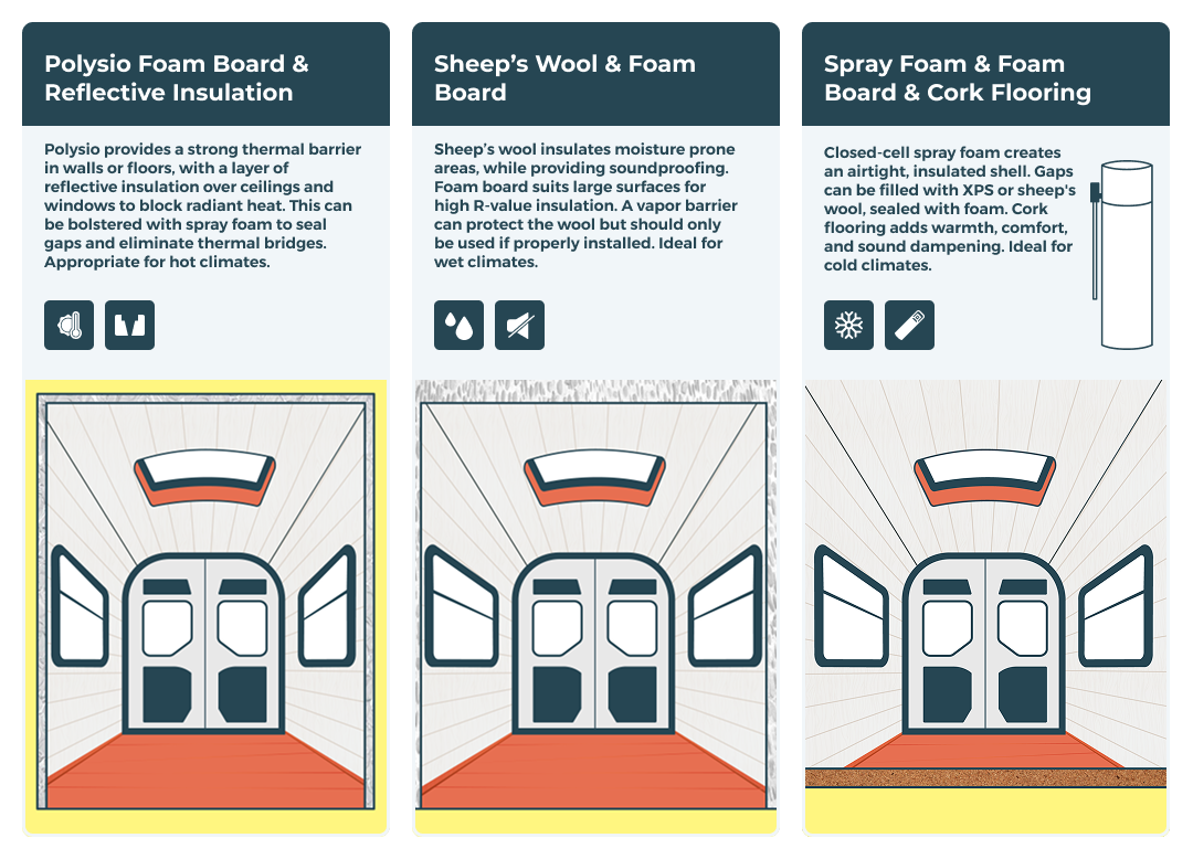 Walls and ceiling | XPS or polyiso foam board (High R-value, moisture-resistant, lightweight) | Sheep’s wool (Breathable, regulates moisture, provides soundproofing) | EPS foam board (More affordable than XPS but still effective) |