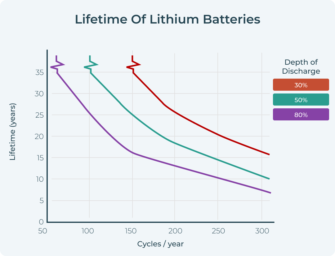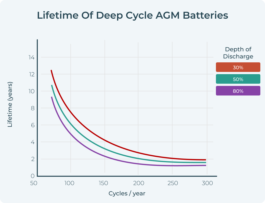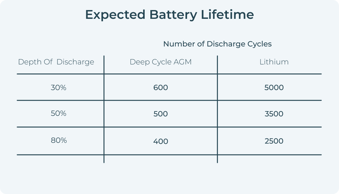 Your batteries will perform more cycles at 30% DoD than 80%. The typical lifetimes of AGM and lithium batteries are shown below.