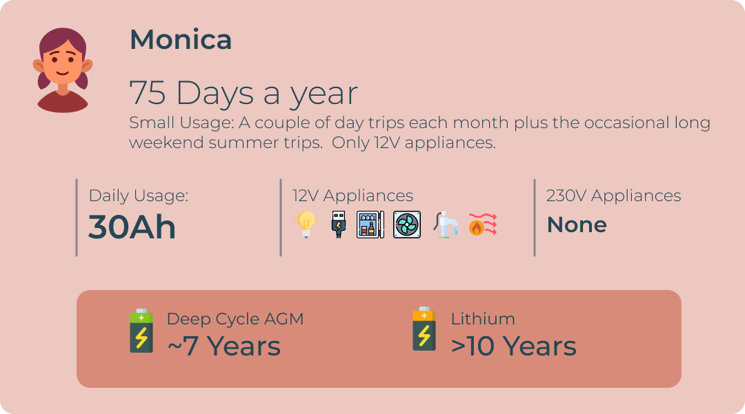 Using the three van user examples, we can see how many discharges each person will get from their campervan leisure battery.