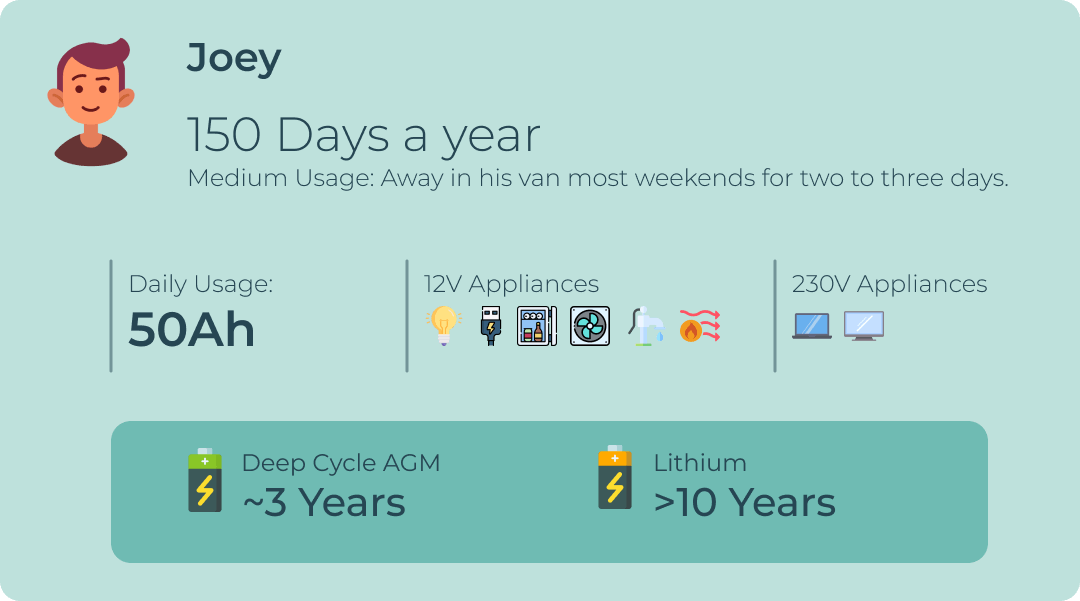 We reckon Joey’s 100Ah AGM battery will last 3.3 years. Not bad, but if he intends to keep his van for the foreseeable future, it may be worth investing in lithium, which we think could last 23.3 years.