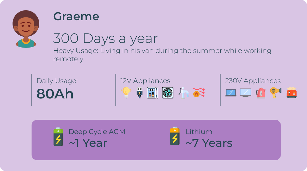 - How does Graeme use his campervan? - Graeme is what we call a full-time van-lifer. He lives in his van all year round and thus needs a lot of energy to power all his appliances, particularly his larger appliances like his microwave and blender.