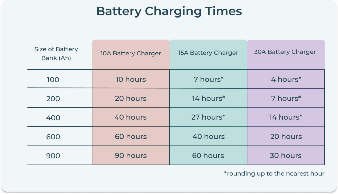 - Charger output amperage. Chargers with a higher amperage can deliver power to the leisure battery quicker. For example, a 20A charger will charge a battery much quicker than a 10A charger. Just make sure the battery can accept the current.