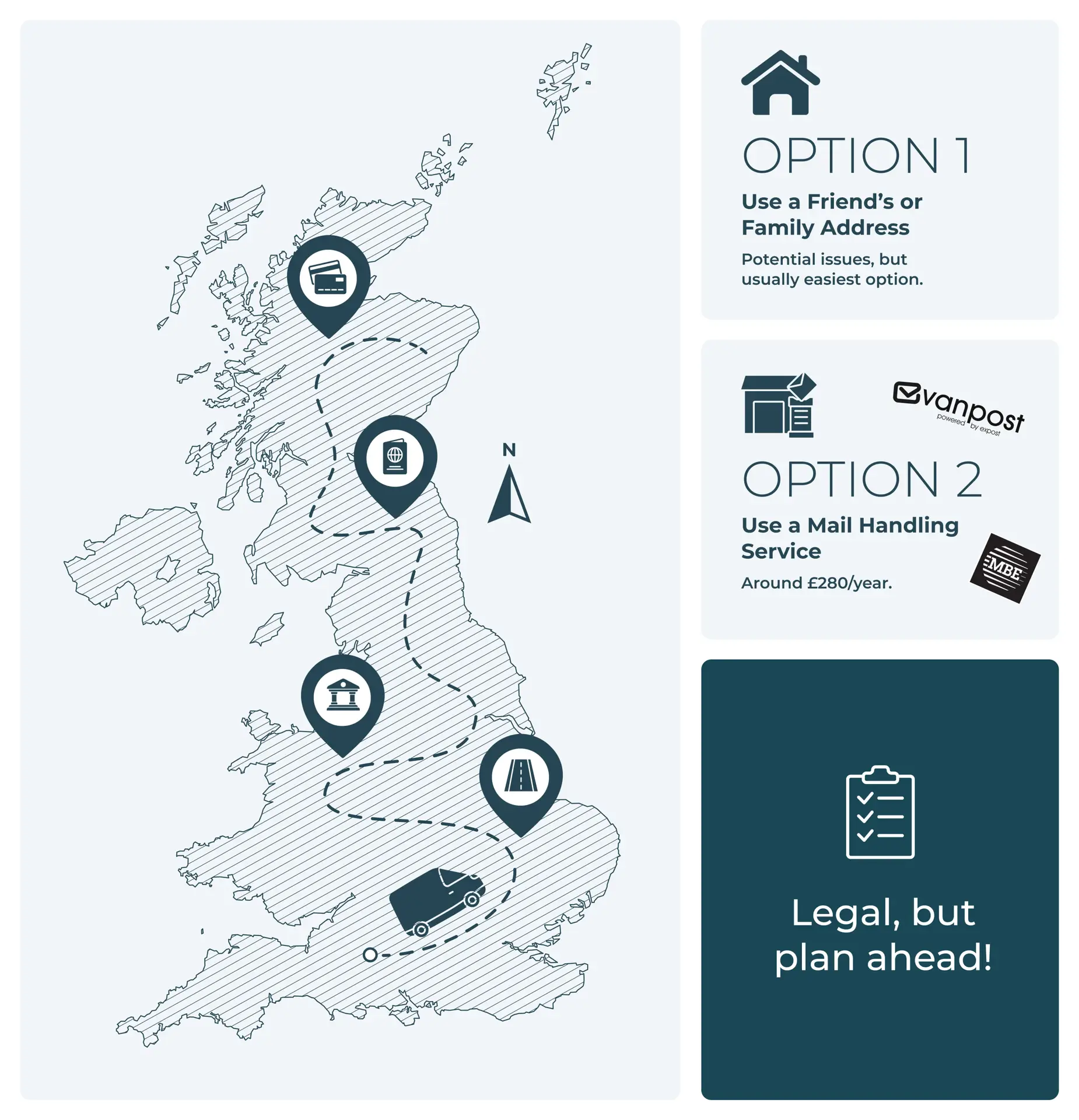In short, yes, it’s legal to live in a van full-time in the UK. However, this isn’t without some important caveats. The first is your address. In the UK, you need a mailing address for things like banks, credit cards, passports, the DVLA, and, of course, mail. This can make it a pain when living in a van, where you technically have no fixed abode.