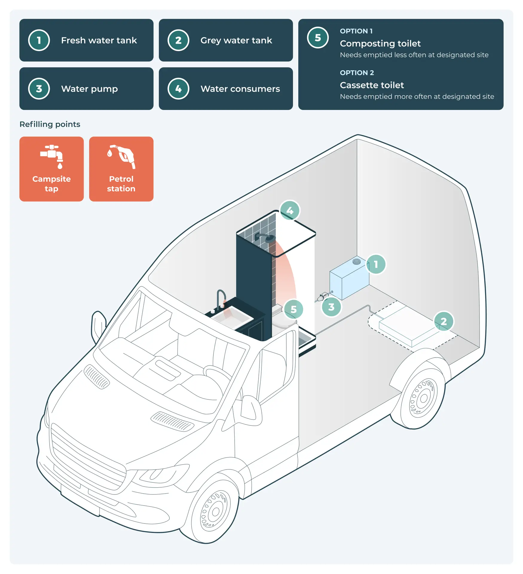 Some vans also have a dedicated tank to collect wastewater (called grey water), while others use simple portable containers that can be emptied manually.