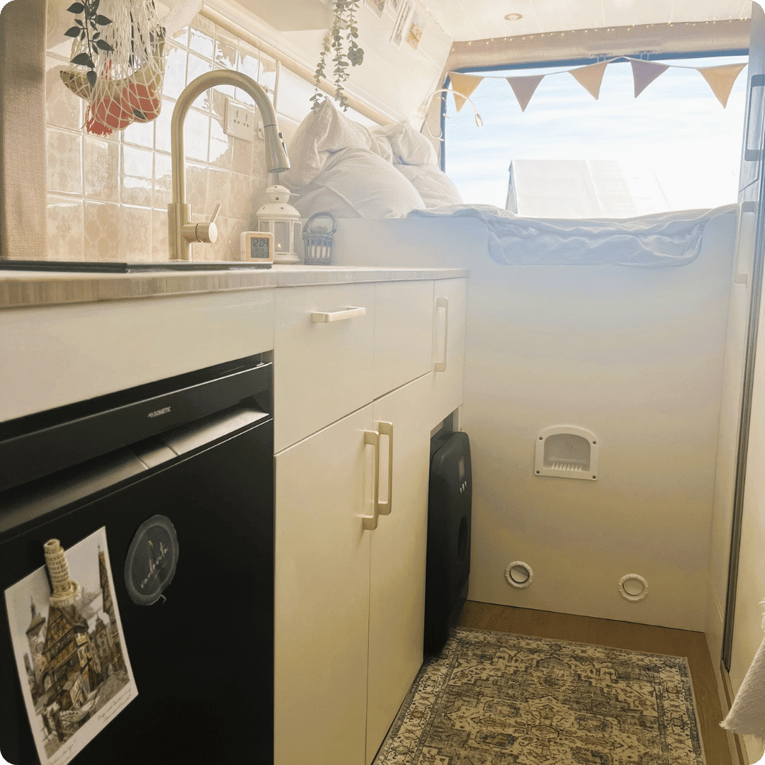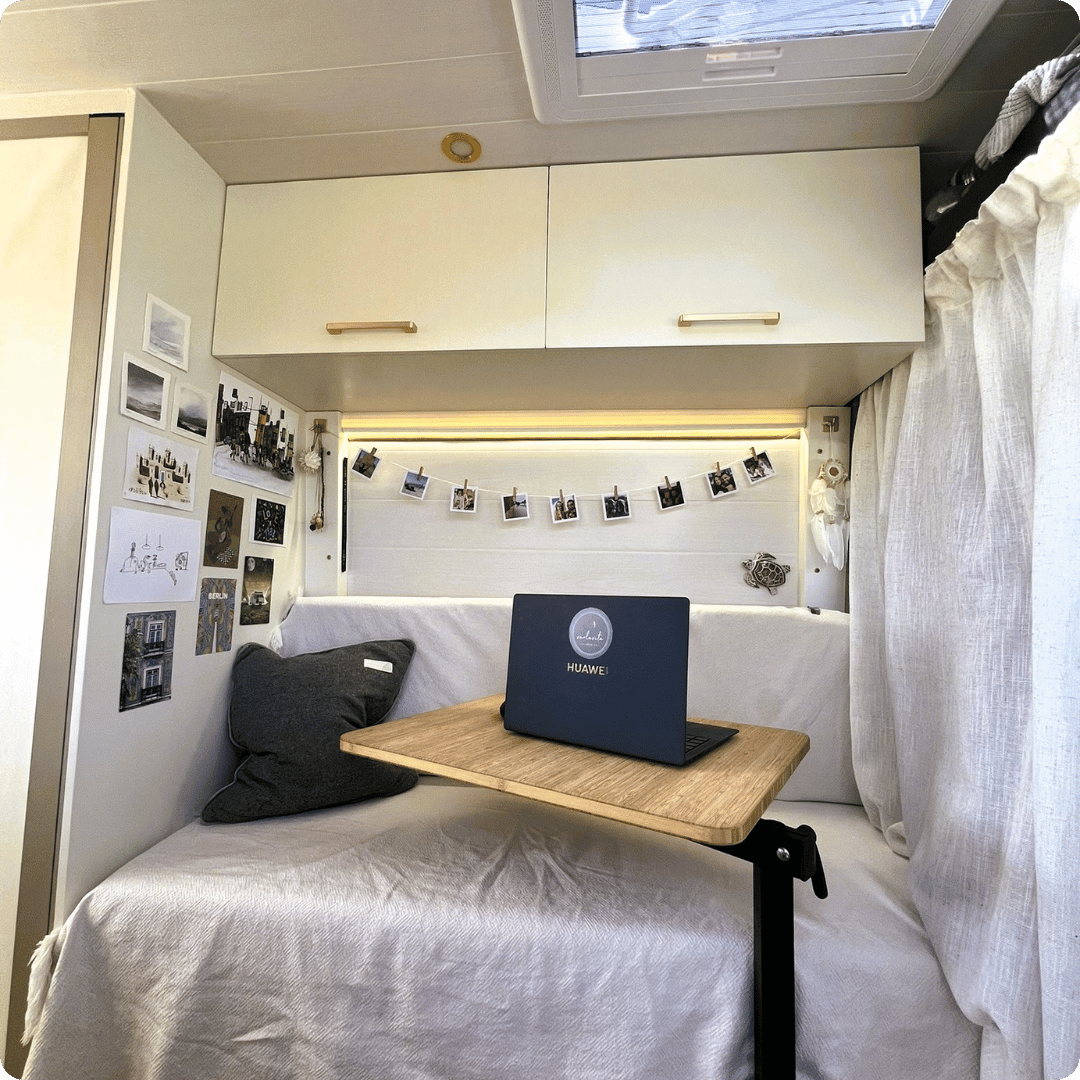 We worked with Homesmith Campers in the UK for the conversion. They offered a fully bespoke service, which was essential for us because I needed a space that could accommodate work as well as daily living. The conversion process took three months, and we were involved in every step, choosing materials, finishes, and the overall design.