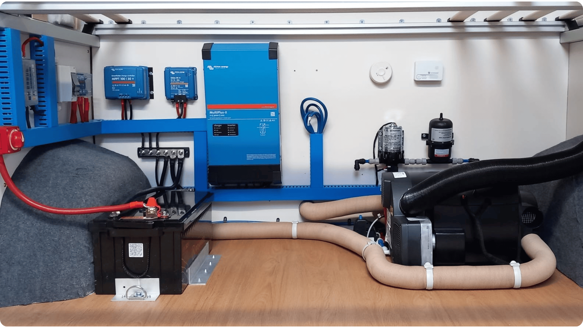 Most things run on 12 volts, like our fridge and fans, but we switch on the inverter for higher-powered appliances like the induction hob or kettle. Our setup has worked perfectly so far, and the team did a great job organizing the electrical system in the "garage" space.